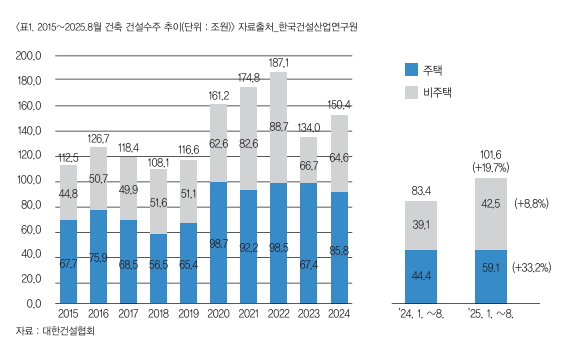 ±¹³» °Ç¼³¼öÁÖ´Â 2022³â 248Á¶4000¾ï¿øÀ¸·Î °íÁ¡À» ±â·ÏÇÑ ÀÌÈÄ 2023³â 207Á¶1000¾ï¿øÀ¸·Î ±Þ°¨Çß´Ù. 2024³â¿¡´Â 218Á¶1000¾ï¿øÀ» ±â·ÏÇßÀ¸¸ç Áö³ÇØ¿¡´Â 1~8¿ù±îÁö ´©Àû ¼öÄ¡·Î 132Á¶9000¾ï¿øÀ¸·Î Àü³â µ¿±â ´ëºñ 3.7% ´Ã¾î³ 128Á¶2000¾ï¿øÀ» ±â·ÏÇÑ °ÍÀ¸·Î ³ªÅ¸³µ´Ù. Áö³ÇØ 1~8¿ù °Ç¼³¼öÁÖ¿¡¼ °ø°ø °Ç¼³¼öÁÖ´Â ¾à 8.4% Ç϶ôÇßÁö¸¸ ¹Î°£Àº 8.3% Áõ°¡Çß´Ù.