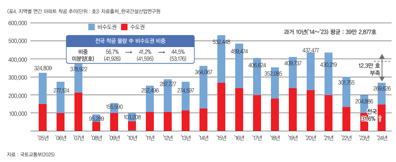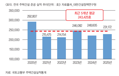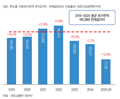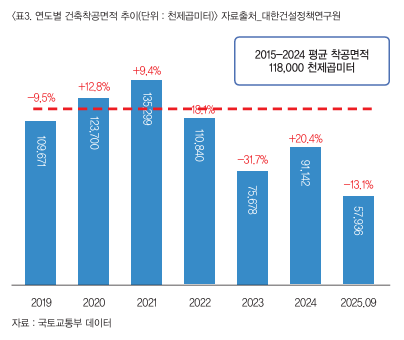 ÃÖ±Ù °ÇÃàÇã°¡¿Í Âø°ø ¸éÀûÀº Å« ÆøÀÇ °¨¼Ò¼¼¸¦ º¸À̰í Àִµ¥ Àå±âÀûÀÎ Æò±Õ ¼öÄ¡·Îµµ ¸Å¿ì ºÎÁøÇÑ »óȲÀÌ´Ù. 2024³â °ÇÃàÇã°¡ ¹× Âø°øÀº 10³â Æò±ÕÀÇ ¾à 77% ¼öÁØÀ¸·Î °¨¼ÒÆøÀÌ »ó´çÇÑ ¼öÁØÀÌ´Ù. 2025³â 9¿ù±îÁö °ÇÃàÇã°¡´Â 12.8%, Âø°øÀº 13% °¨¼ÒÇß´Ù.