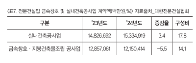 °Ç¼³°æ±â ºÎÁø ¿µÇâÀ¸·Î ±Ý¼Óâȣ·ÁöºØ°ÇÃ๰Á¶¸³°ø»ç¾÷À» Æ÷ÇÑÇÑ ´ëºÎºÐÀÇ Àü¹®°Ç¼³¾÷ °è¾à¾×Àº 2023³â ÀÌÈÄ °¨¼Ò¼¼¸¦ º¸À̰í ÀÖ´Ù. ´ëÇÑÀü¹®°Ç¼³Çùȸ ÀÚ·á¿¡ µû¸£¸é 2024³â ¾÷Á¾º° °è¾à¾×¿¡¼ ±Ý¼Óâȣ·ÁöºØ°ÇÃ๰Á¶¸³°ø»ç¾÷ °è¾à¾×Àº 12Á¶1504¾ï¿øÀ¸·Î Àü³â µ¿±â 12Á¶ 8570¾ï¿ø ´ëºñ 5.5% Ç϶ôÇÑ °ÍÀ¸·Î ³ªÅ¸³µ´Ù.