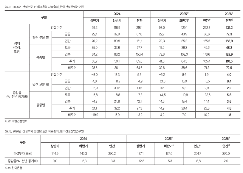 2026³â ¿ÃÇØ ±¹³» âȣ½ÃÀåÀº °Ç¼³°æ±â¿Í ÁÖÅýÃÀåÀÇ Àü¹æ»ê¾÷ ħü¿¡ ¿µÇâÀ» ¹ÞÀ¸¸ç ¾÷Ȳ ȸº¹Àº ´Ù¼Ò ´õµð°Ô ÁøÇà µÉ °ÍÀ¸·Î Àü¸ÁµÇ°í ÀÖ´Ù. ¿ÃÇØ °Ç¼³¼öÁÖ´Â Áö³Çغ¸´Ù Áõ°¡ÇÒ Àü¸ÁÀÌÁö¸¸ °ø»çºñ »ó½Â µî¿¡ µû¶ó ¹Î°£ºÎ¹® ¼öÁÖ ¹°·® Áõ°¡´Â Á¦ÇÑÀûÀÏ °ÍÀ¸·Î ¿¹»óµÇ´Â »óȲ¿¡ ½Å³âÀ» ¸Â¾Æ ÃÖ±Ù °Ç¼³°æ±â ÁöÇ¥ ºÐ¼®°ú ±¹³» âȣ½ÃÀå µ¿Çâ°ú Àü¸Á¿¡ ´ëÇØ Á¤¸®ÇØ ºÃ´Ù.